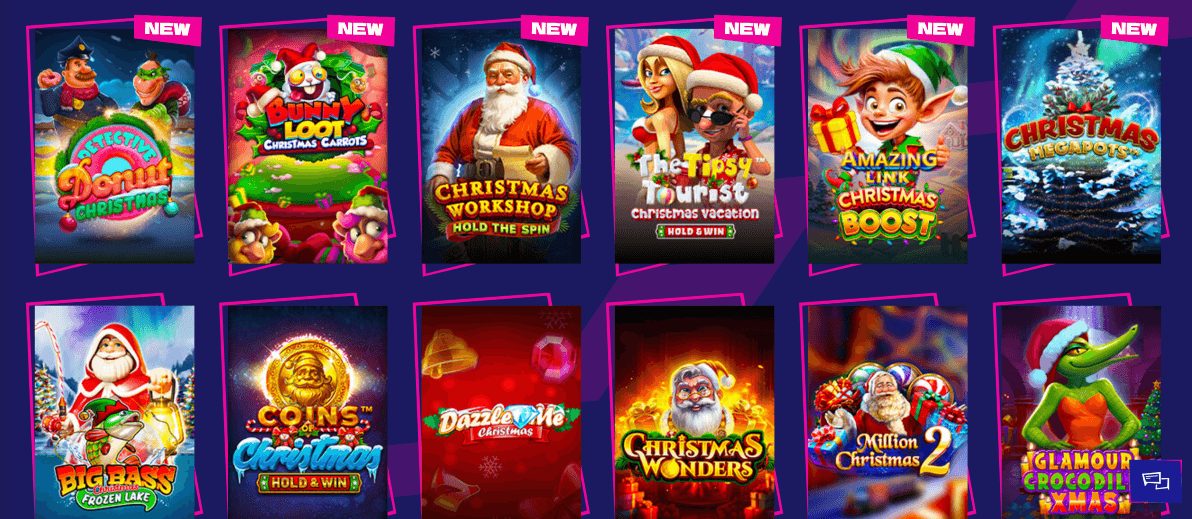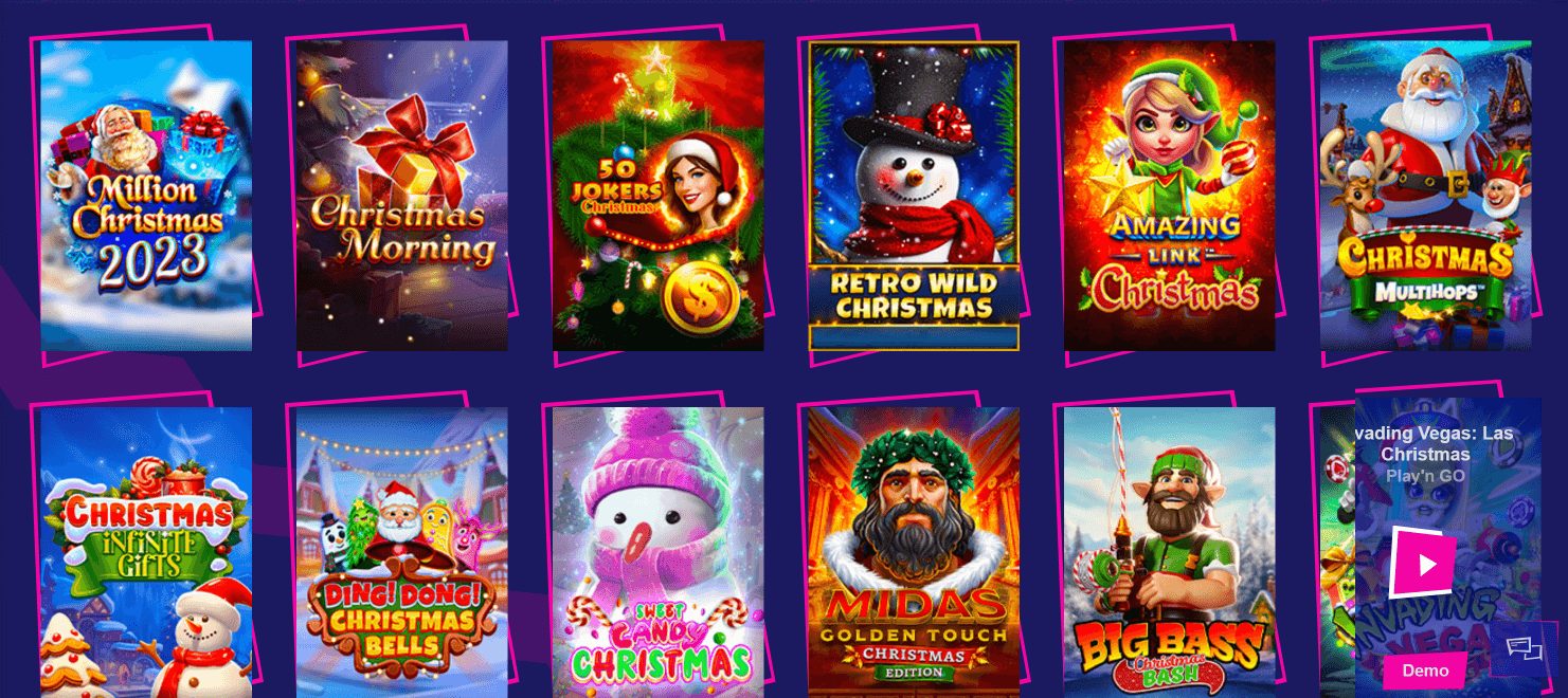 На сајтот ќе најдете над 6.000 онлајн слотови, вклучително и посебна категорија за божиќни игри. Повеќе од 80 празнични слотови се достапни, меѓу кои Snow Slingers, Book of Santa и Royal Xmas, од познати провајдери како Yggdrasil, Spinomenal и BGaming.