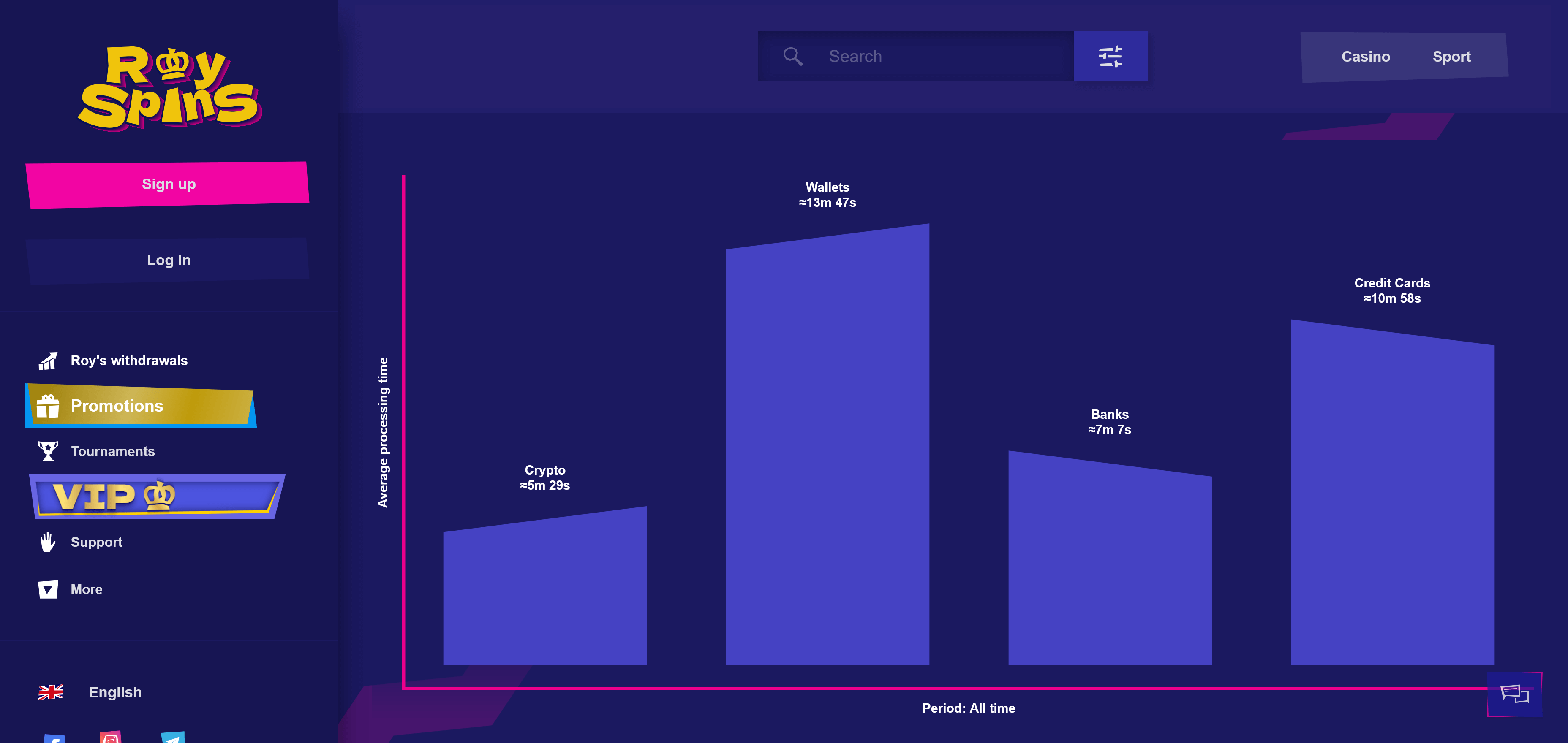 Нема ограничувања за повлекување, што го прави совршено место за high roller играчи. Повеќето исплати се реализираат за 5–10 минути, зависно од мрежниот сообраќај. Ова се само дел од причините поради кои RoySpins е на листата на онлајн казина со најбрзи исплати.